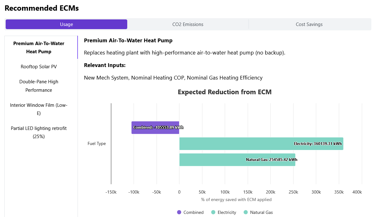 Whether it’s a heat pump retrofit or envelope upgrade, AI-powered models simulate energy savings, carbon reductions, and payback periods customized for each building’s specific characteristics.